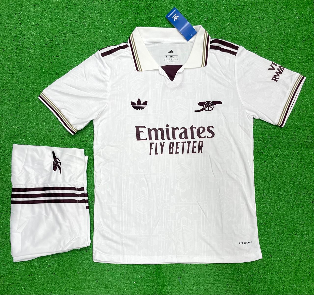 Honoring 20 years since the final season at Highbury, this Arsenal 2025/26 Third Kit – Fan Version kit pays stylish tribute to Arsenal’s storied past while offering a refined, accessible look for supporters. The design features a crisp off-white base, elegantly complemented by rich maroon and gold detailing, reminiscent of the beloved 2007–09 alternative kit. A classic polo collar with maroon-gold stripes adds a vintage touch, and the textured jacquard fabric—echoing the Art Deco architecture of Highbury—brings subtle, architectural flair. The shirt replaces the full crest with a standalone cannon emblem at the chest, finishing the look with heritage charm.