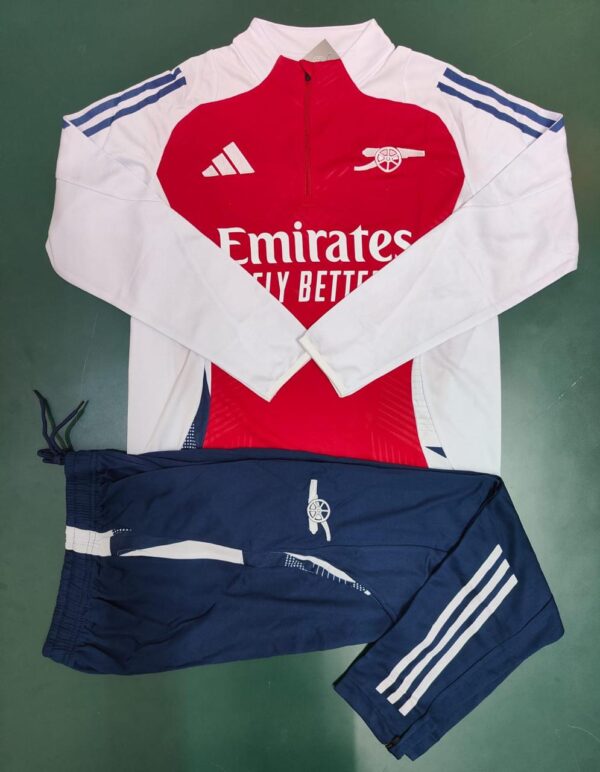 Arsenal’s White training suit for the 2024/25 season is a sleek and functional design! The suit features a black base with embroidered Arsenal club crest on the chest. It’s crafted from high-quality materials to ensure durability and comfort during training sessions. These suits are designed for both performance and comfort, featuring adidas’s AEROREADY technology to keep you dry and comfortable during training sessions.