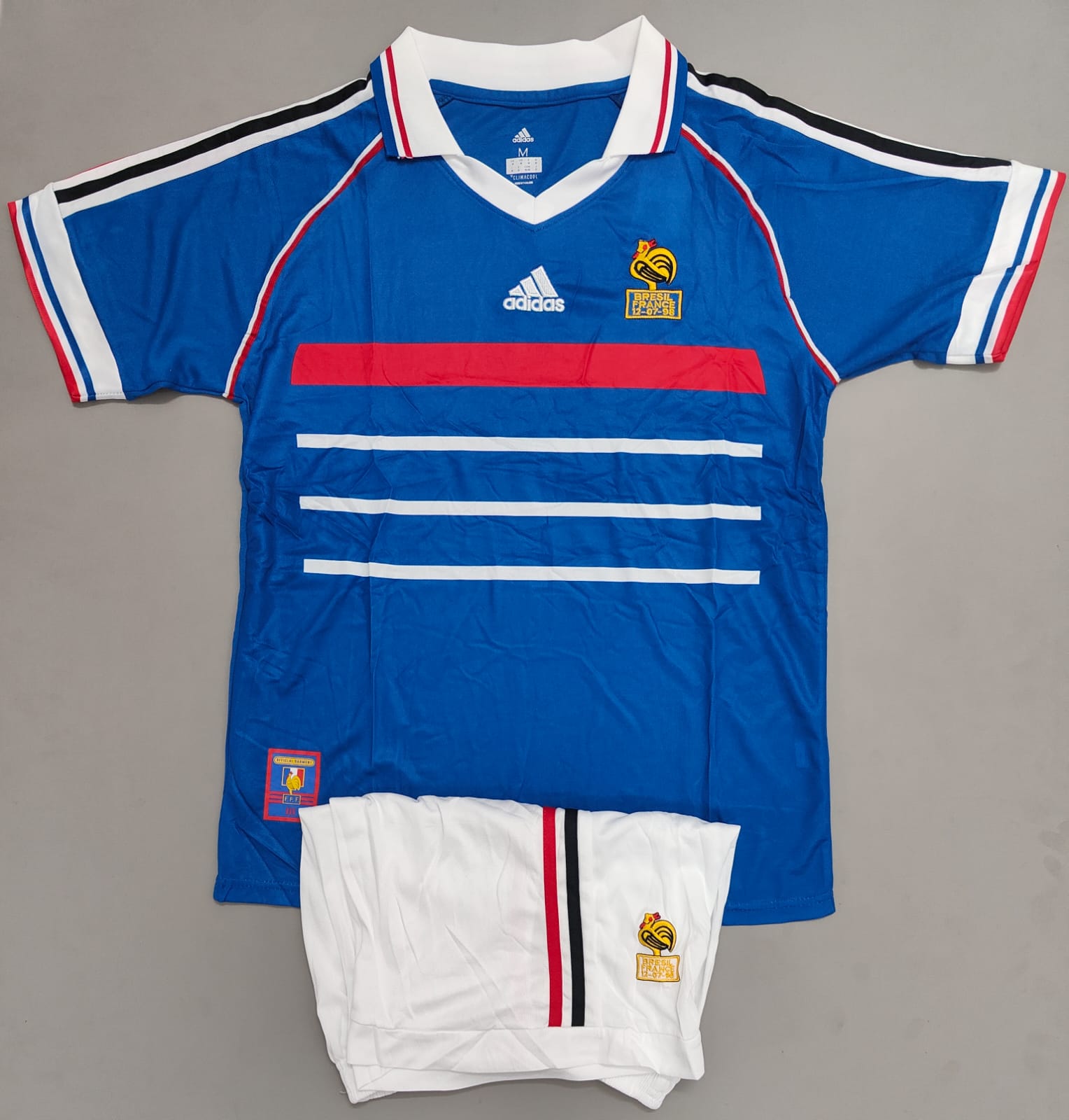 Adidas Branding: The iconic Adidas logo is prominently displayed on the right chest, while the French rooster crest is embroidered on the left, showcasing the nation’s emblem.