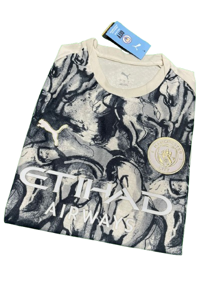 This edition showcases powerful symbolism through refined design. First, a deep midnight-blue base reflects Manchester City’s identity while adding intensity. Then, flowing horse-inspired graphics move across the fabric, symbolizing speed and endurance. Additionally, metallic silver accents highlight key areas and enhance the premium feel. Subtle pattern layering adds depth without overwhelming the look. Altogether, the jersey feels dynamic, elegant, and full of motion.