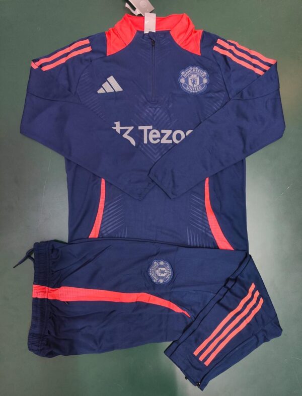 Manchester United’s blue training suit for the 2024/25 season is a striking and functional design! The suit features a deep blue base with embroidered Manchester United crest on the chest. It’s crafted from high-quality materials to ensure durability and comfort during training sessions.The suit includes Adidas Aeroready  technology, which wicks sweat away from the skin for breathability and comfort. It’s designed with a slim fit to provide a streamlined look and optimal performance.