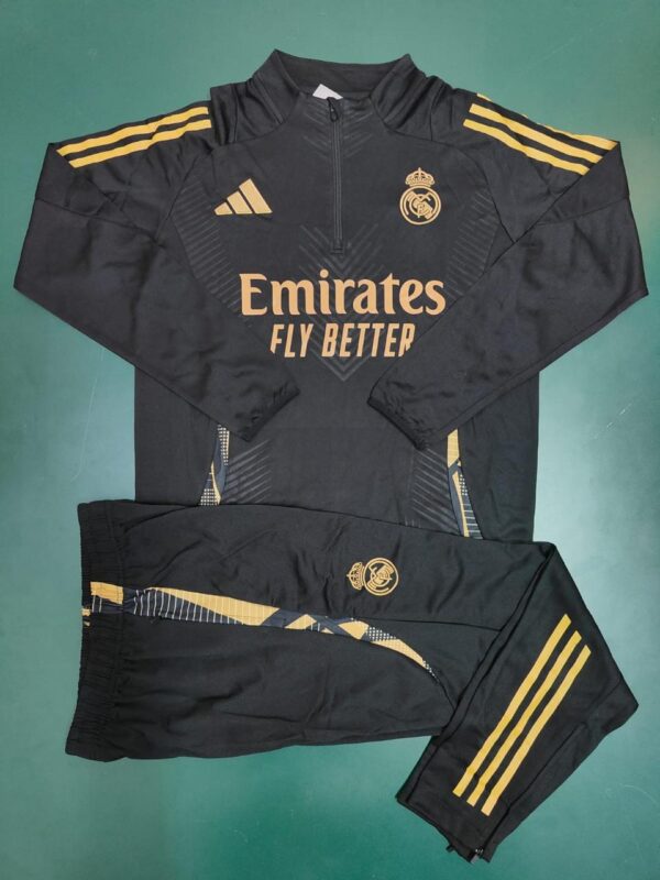 Real Madrid’s Black training suit for the 2024/25 season is a classic and stylish design! The suit features a white base with embroidered Real Madrid crest on the chest. It’s crafted from high-quality materials to ensure durability and comfort during training sessions. The suit includes Adidas Aeroready technology, which wicks sweat away from the skin for breathability and comfort. It’s designed with a slim fit to provide a streamlined look and optimal performance.