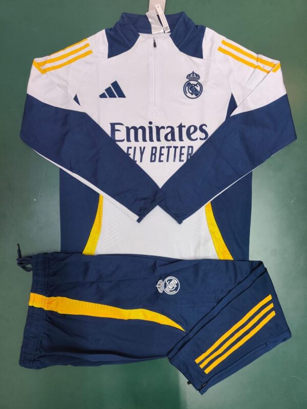Real Madrid’s white training suit for the 2024/25 season is a classic and stylish design! The suit features a white base with embroidered Real Madrid crest on the chest. It’s crafted from high-quality materials to ensure durability and comfort during training sessions. The suit includes Adidas Aeroready technology, which wicks sweat away from the skin for breathability and comfort. It’s designed with a slim fit to provide a streamlined look and optimal performance.